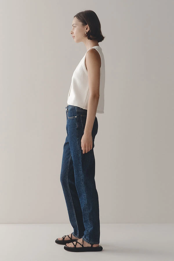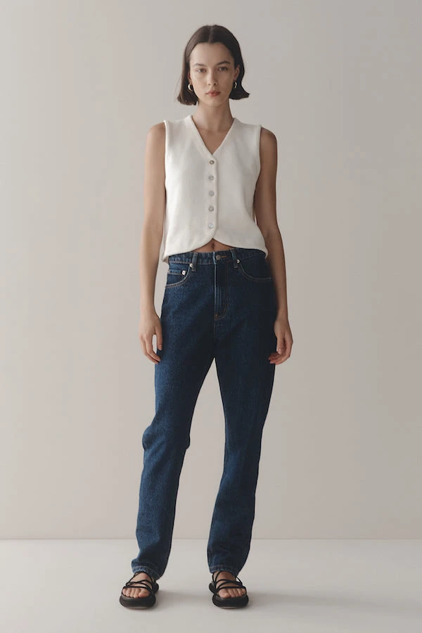 The Marle Kate Waistcoat is finely knitted in 100% cotton. It has a simple, boxy silhouette with a V-neckline secured by tonal shell buttons down the centre front. This waistcoat falls at a semi-cropped length.