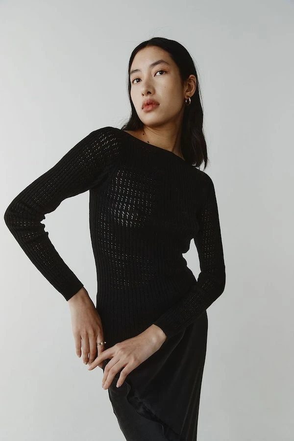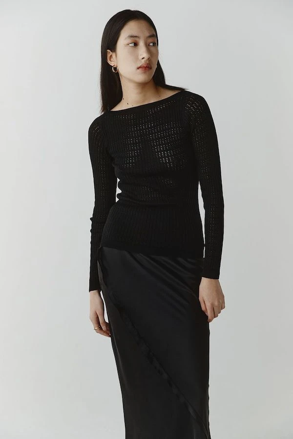 The Marle Leila Top Black is kitted in a cashmere / silk / tencel / cotton yarn. It is knitted using a pointelle stitch which gives a subtle sheerness and has a round neckline, long sleeves and fitted silhouette.