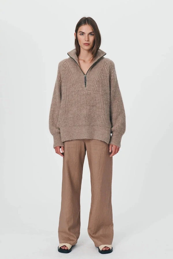 Rowie’s best selling Leo Knit Jumper returns in a neutral Hazelnut Marle. Crafted from a snug, mohair blend, this updated full-length sweater features a half-zip funnel neck and side splits for a flattering shape. The wide hem band and timeless style of the Leo Knit make this piece the perfect addition to your wardrobe for seasons to come.
