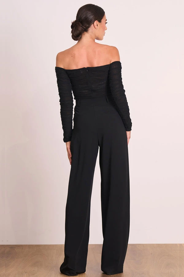 is made from a stretch mesh. This chic silhouette is made contemporary through the elongated gathering throughout. Lined through the bodice and with sheer sleeves the off shoulder neckline shows a bit of skin whilst also balancing this on trend look.