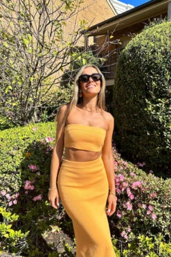 Zulu & Zephyr The Mandarin Organic Cotton Blend Knit Bandeau features an elasticated neckline for support and a versatile cropped length, in a sunny mandarin, soft stretchy knit. Pair with the coordinating Mandarin Organic Cotton Blend Knit Skirt or with the Cabana Stripe Organic Cotton Blend Knit Pant or Butter Linen Pant.