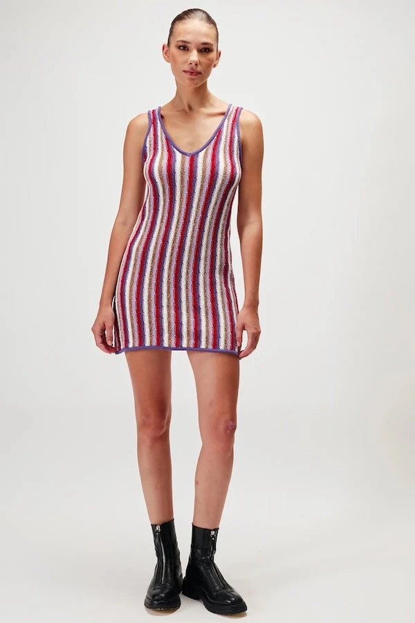 This beautiful mini dress features our new knit rib technique with gold lurex, a V neckline, and a straight fit to