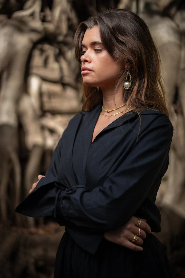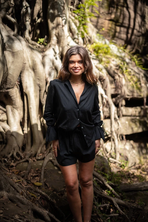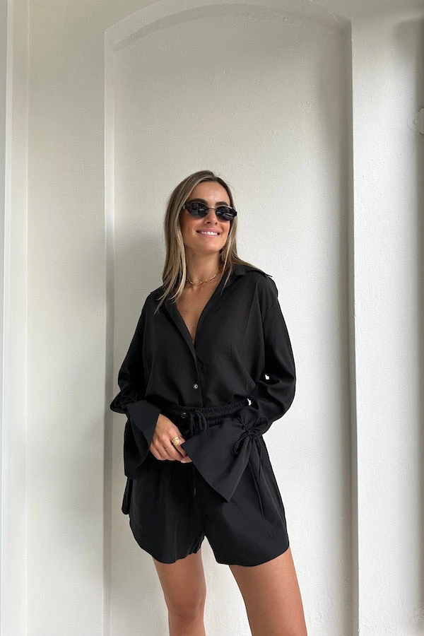 The Sneaky Link Open Neck Blouse. Your new favourite shirt (trust us), unisex and finished with tie details on the sleeves and a flat collar. We love this piece worn open, styled with our unisex shorts and a Hunza G bikini or white tank top. Alternatively style over denim or white pants and heels for a more elevated look.