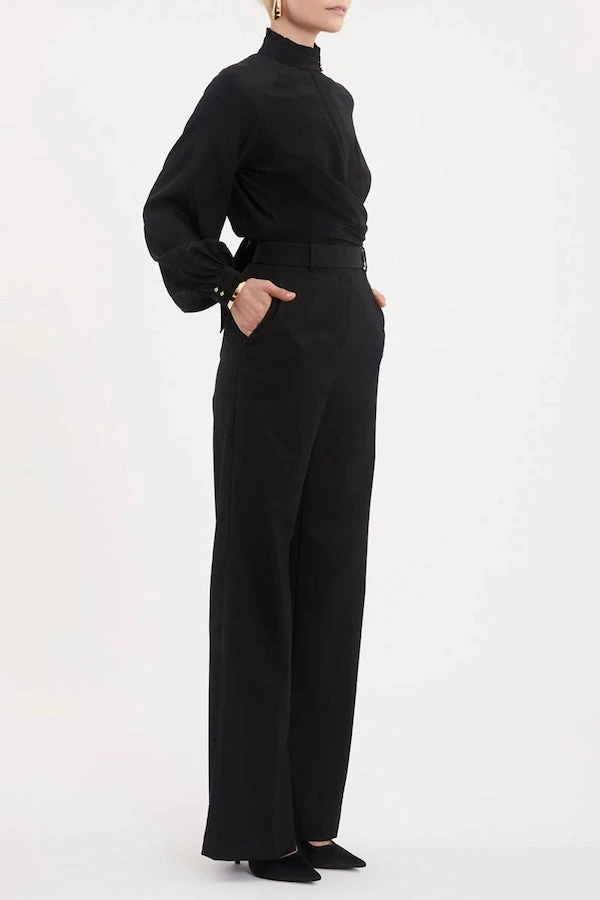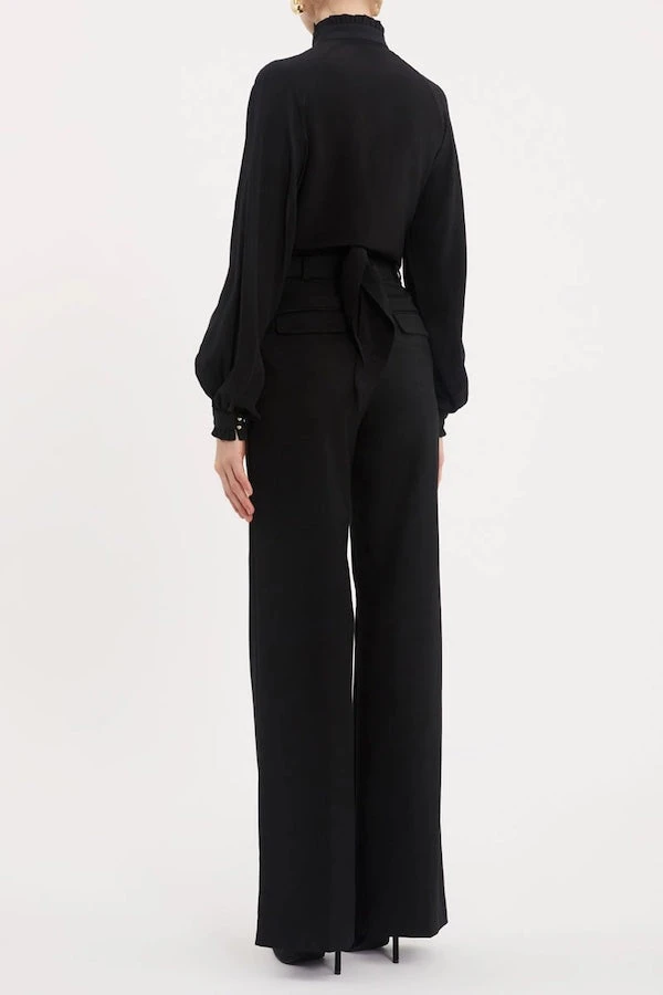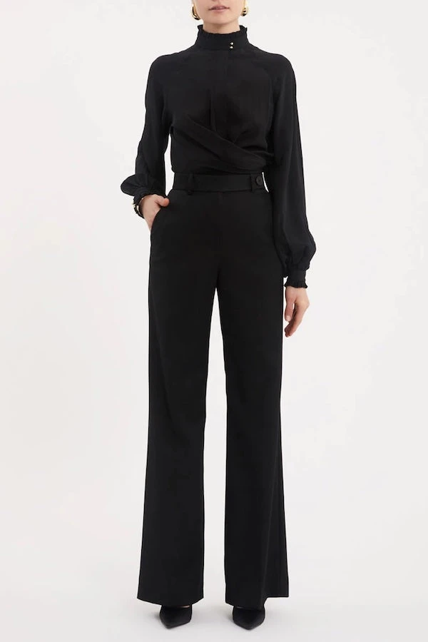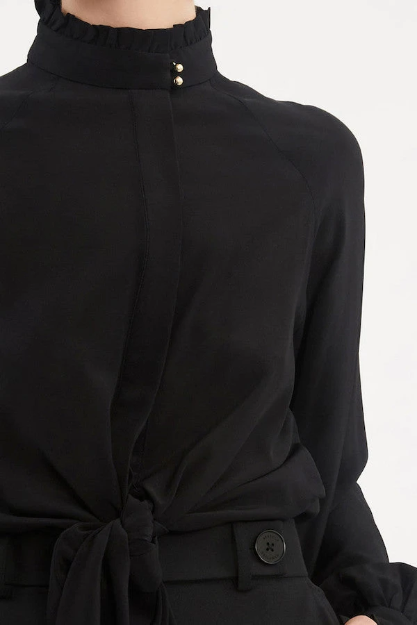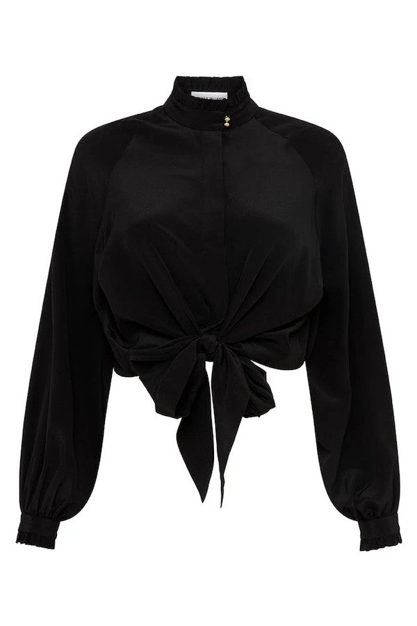The Rebecca Vallance Sloane Top is beautifully crafted from a light-weight silk fabrication, designed to sit cropped with a frilled neckline, raglan sleeves with gold ball shank buttons to close. It’s a wrap front bodice and features a concealed placket. Wear yours with your hair in an updo to showcase the neckline. Can be tied three ways: front tie, back tie and as a wrap around around the waistline too.