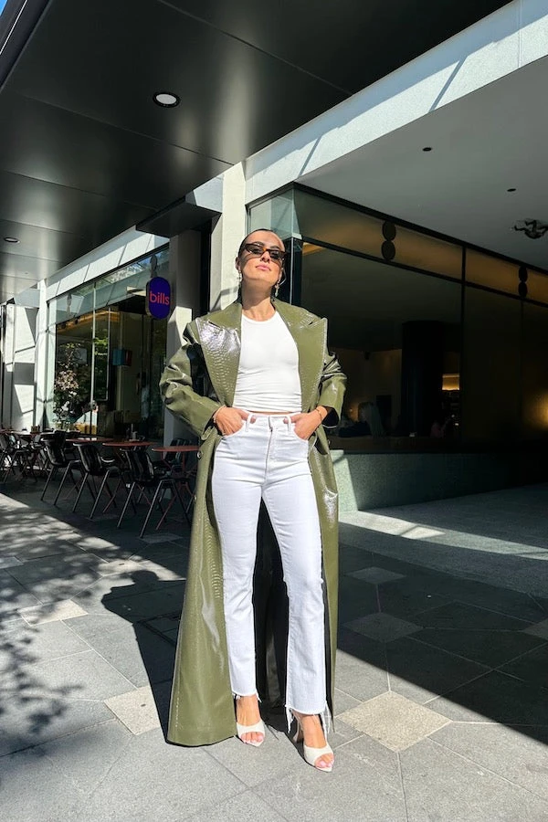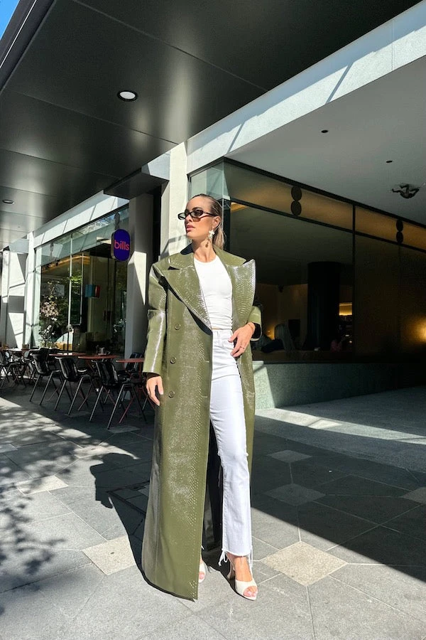 Introducing the Ronny Kobo Roxton Coat in Dark Olive. This exquisite coat is a statement piece that will elevate your style.
