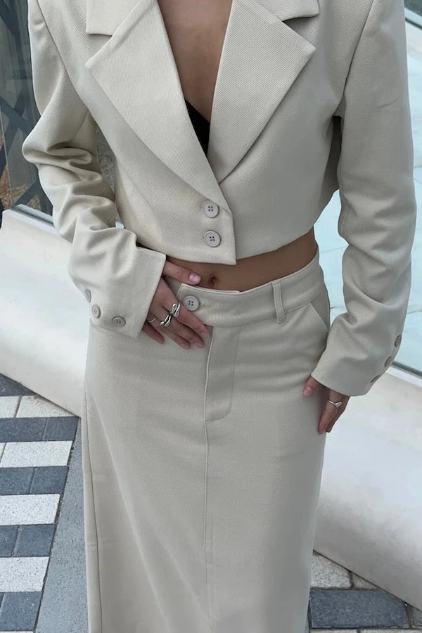 The Crop Blazer is made from a heavy, textured fabric and is designed to have a slight boxy silhouette. Featuring a centre front closure and tonal buttons on the wrist cuffs. Style with the Maxi Skirt for an elevated suiting option or mix and match with your favourite pair of pants. Designed with a contrast green lining, Sotto’s signature pop of colour.