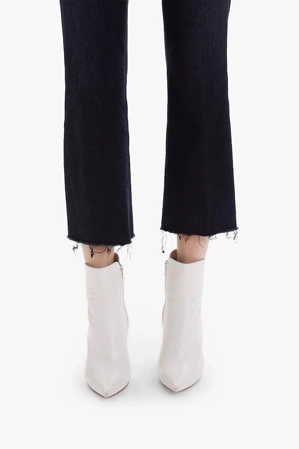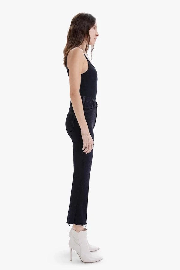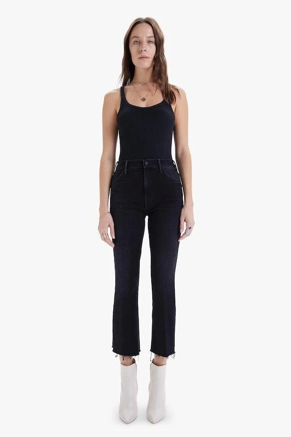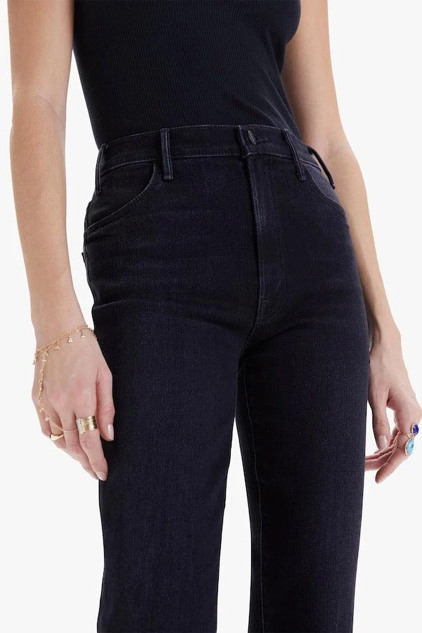 Outta this world. This bestselling high-rise flare has an ankle-length inseam and a raw hem. Made from super soft stretch denim in a deep black wash with a subtle white grain.