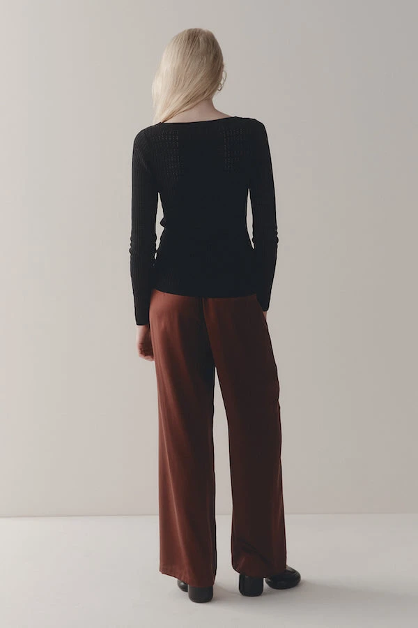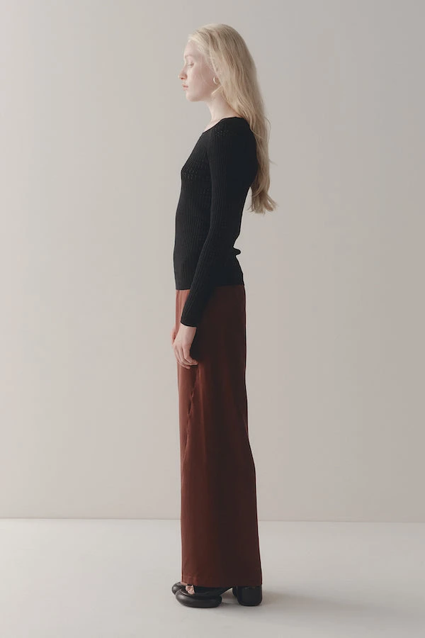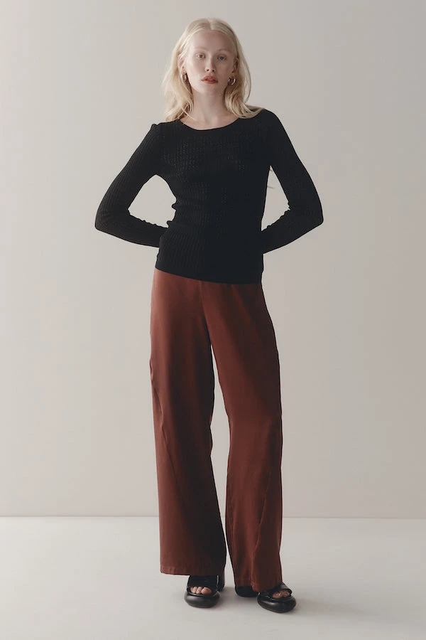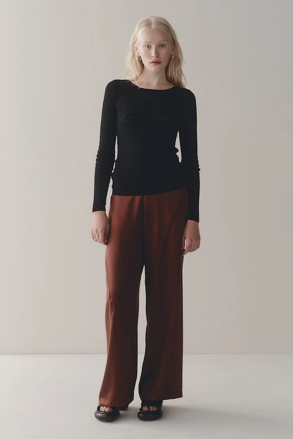 The Marle Tiana Top features a fitted silhouette knitted in a cashmere / silk / tencel / cotton yarn using a pointelle stitch which gives a subtle sheerness. This top has a fitted silhouette with a round neckline and long sleeves.