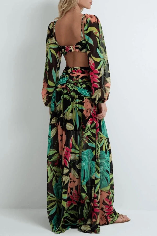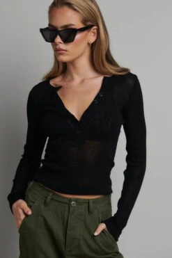 Cropped top features a cross-front neckline made from stretch Lycra fabric. Attached sleeves are made from semi-sheer chiffon fabric, and can be styled on and off the shoulders. Pull-on fit. Runs true to size.