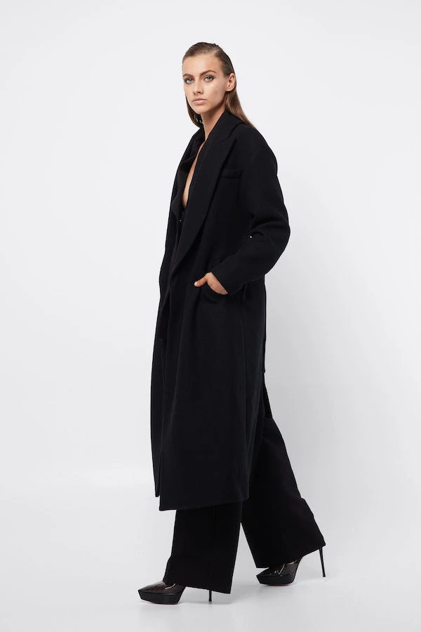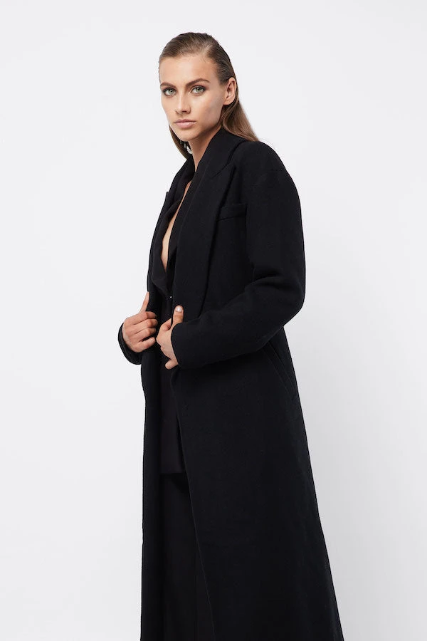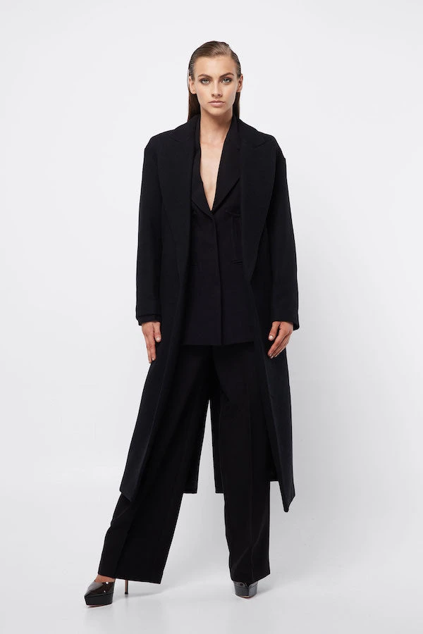 Discover your new winter staple piece with the Venture Coat by Mossman. Sporting a black hue, a structured collar and a heavy weight wool blend fabrication, this coat is the ultimate winter essential. Throw it over The Habitual Shirt and The Habitual Pant for a fierce burgundy ensemble.